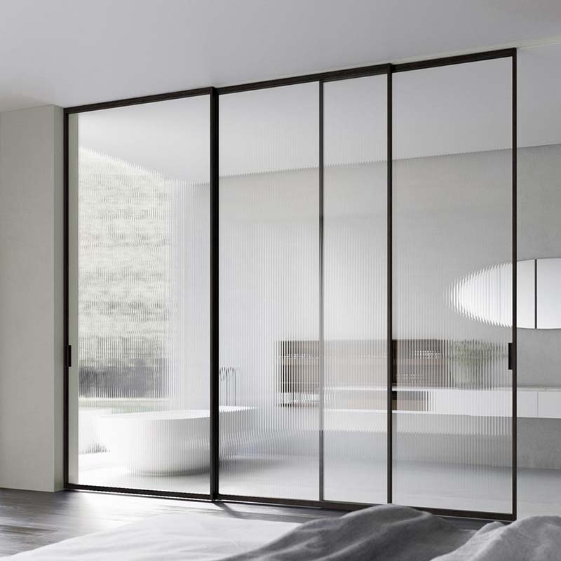 این درب ها داخل یک ریل استیل یا آلومینیومی که با یراق آلات خاصی پوشانده شده حرکت کرده و درب به راحتی باز یا بسته میشود. شیشه سکوریتی که برای این نوع درب ها انتخاب میشود با ضخامت 10 میلیمتر بوده و ازلحاظ زیبایی، دوام و تحمل فشار در درجه بالایی قرار دارد. نصب دستگیره های بزرگ و شیشه های دو لایه لمینت نیز در این نوع درب ها رایج است.