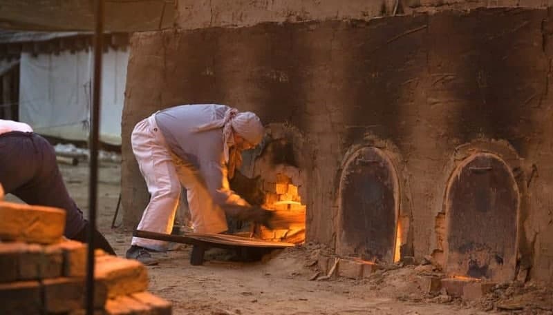 - پختن خشت ها: آجرها پس از خشک شدن توسط ارابه ها وارد کوره های بزرگ شده که در دمای تقریبا ۹۰۰ درجه سانتی گراد بین ۴۰ تا ۱۵۰ ساعت با توجه به کوره و خاک پخته می شوند و از در دیگر کوره ها خروج پیدا می کنند. در این مرحله می توان در زمانی معین با اضافه کردن سوخت به آجرها رنگ های متفاوتی برای آنها ایجاد کرد.